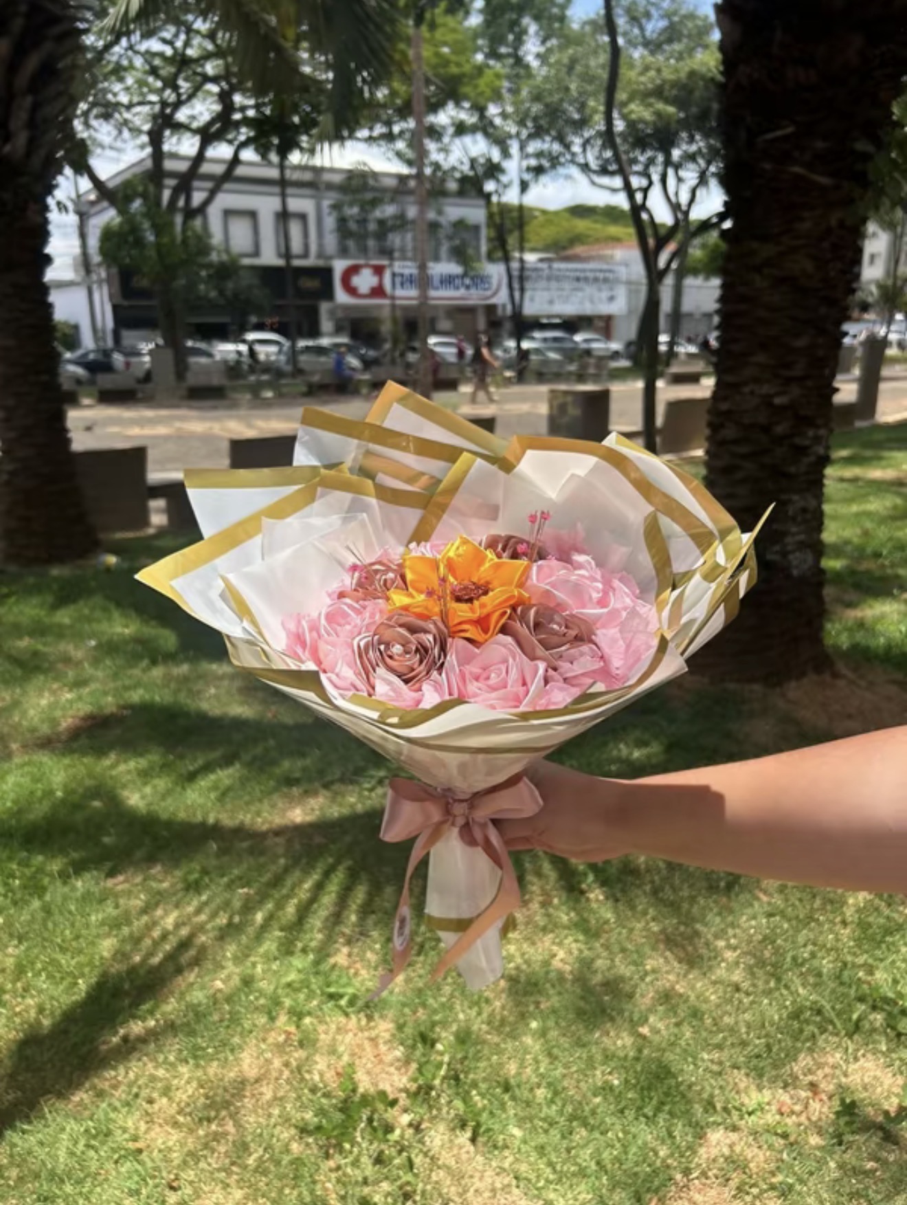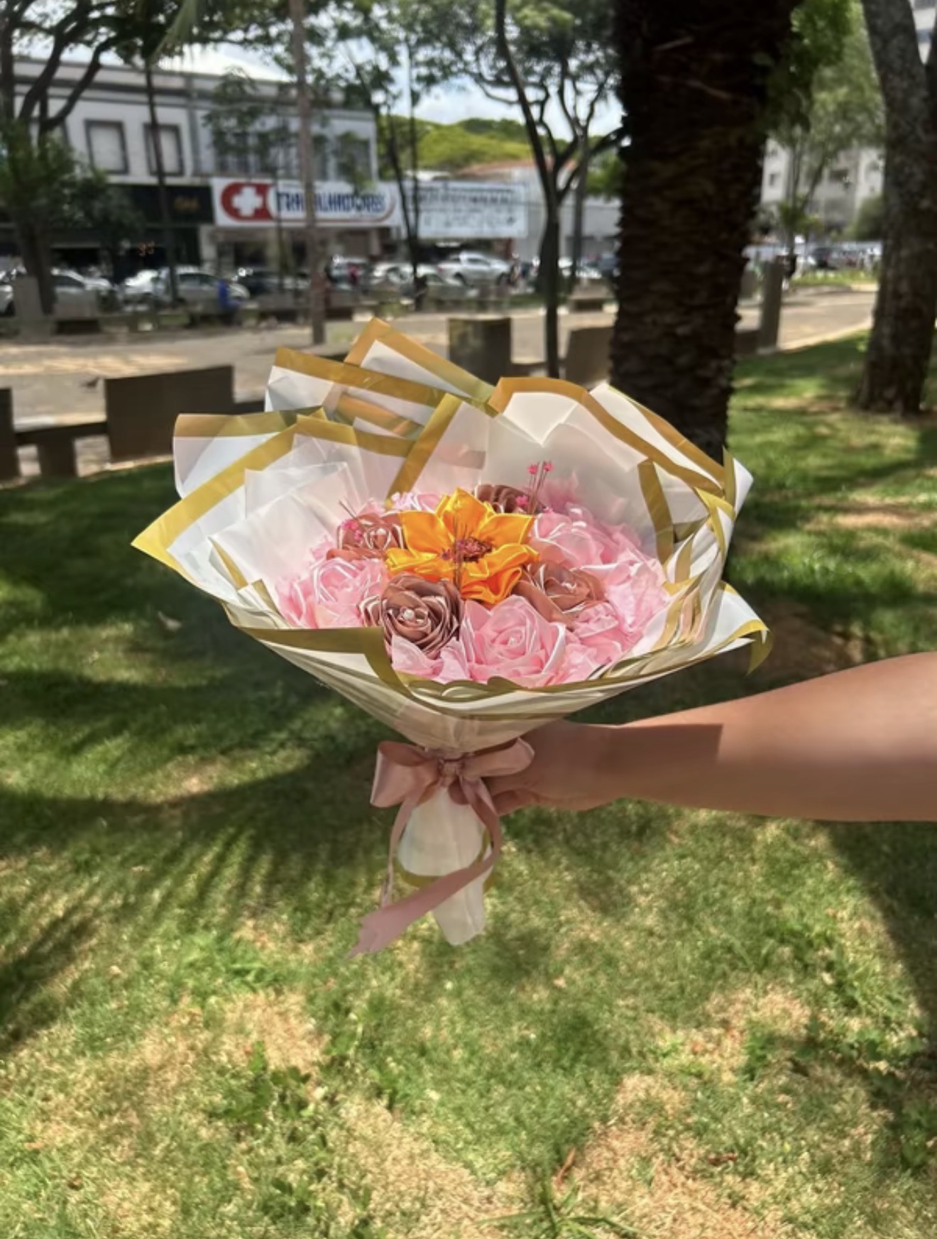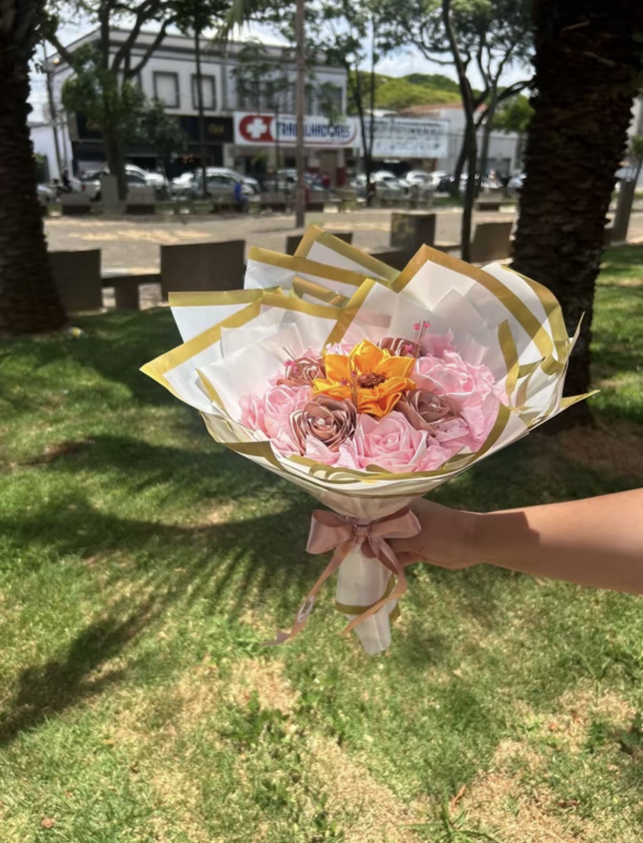 Buque de 8 rosas de cetim com 1 girassol e perolas quantidade