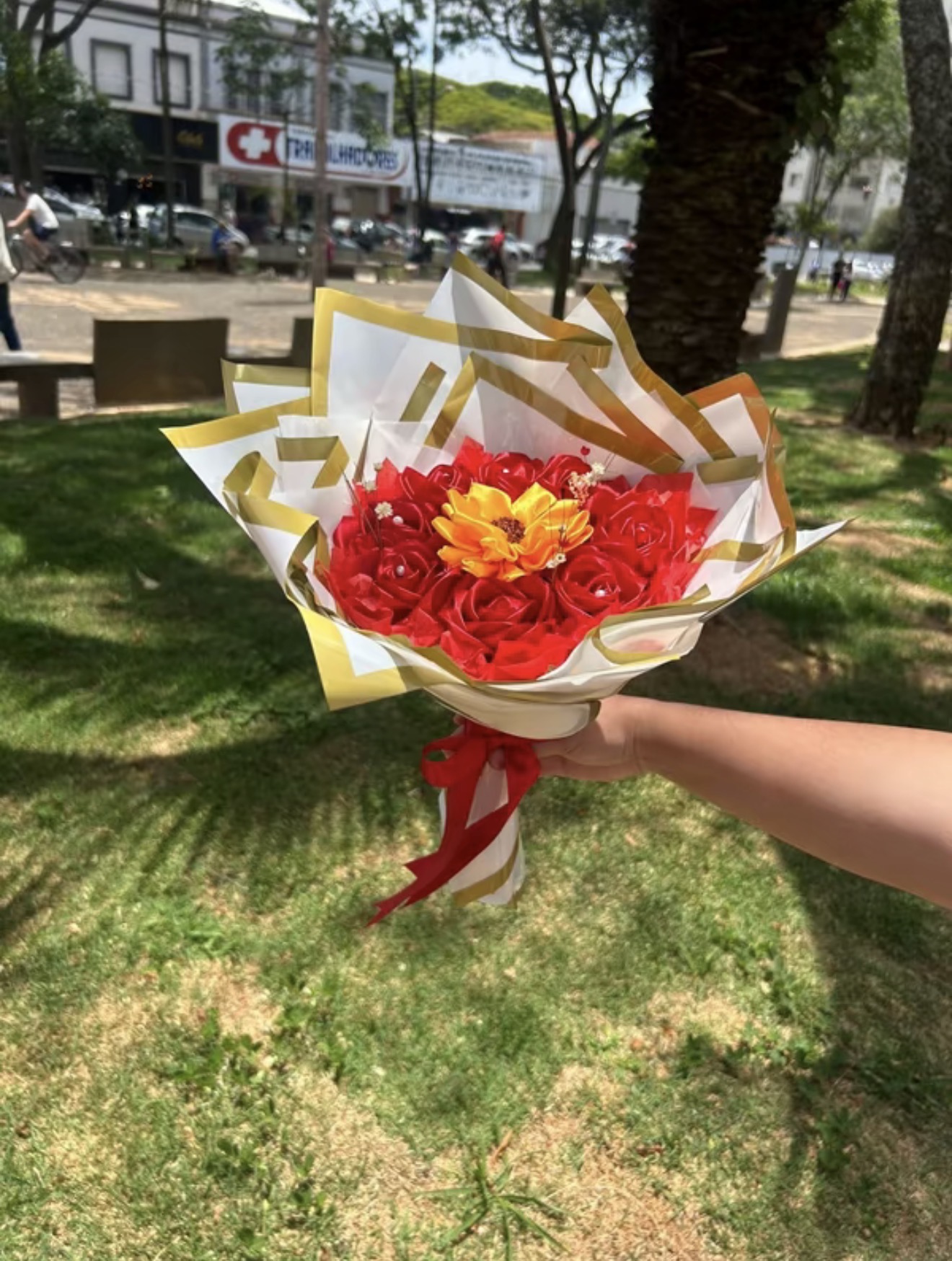 Buque de 8 rosas de cetim com 1 girassol e perolas